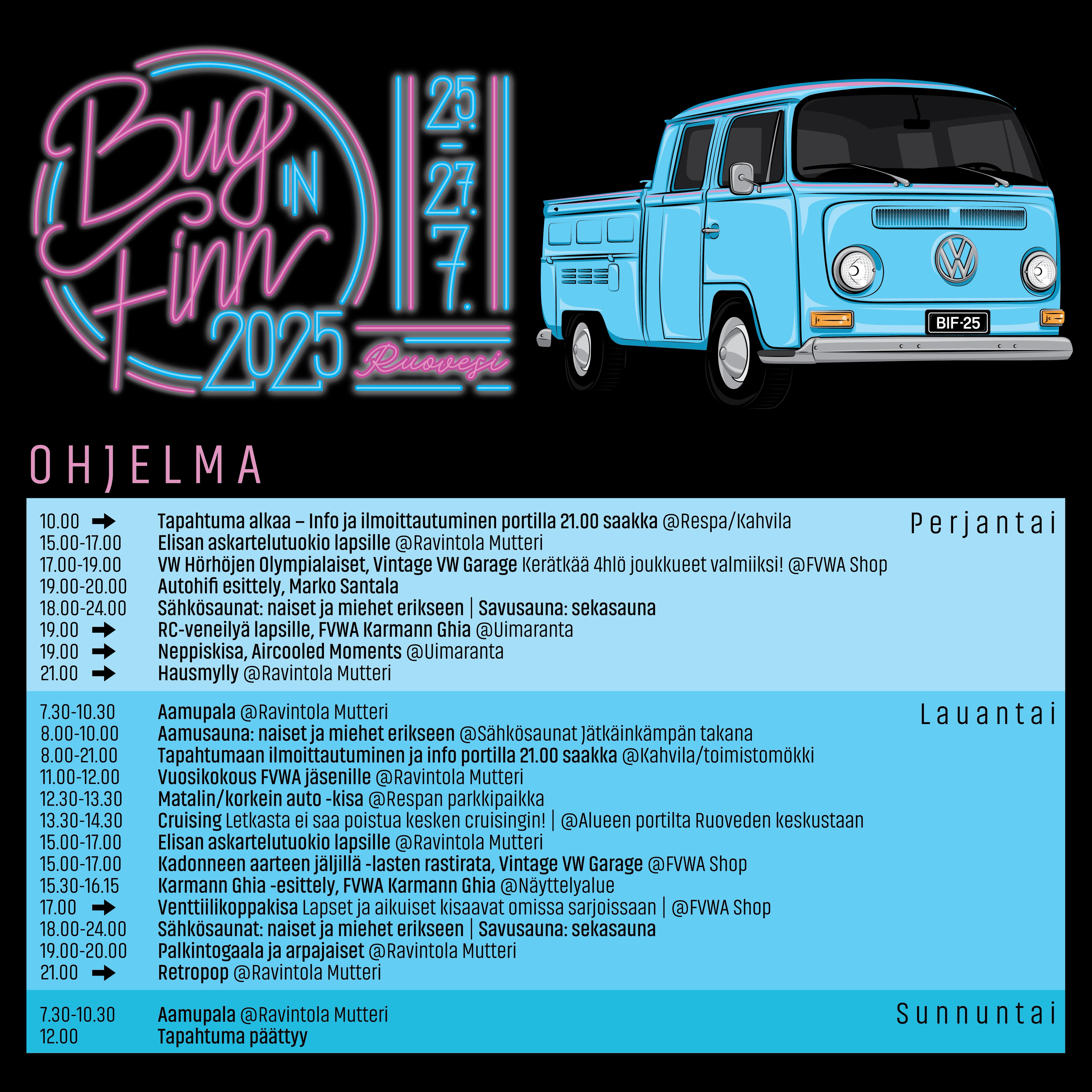 The cruising is driven on Saturday, starting at the Haapasaari area gate. Note, that if you attend the cruising you need to stay on the route all the way to the end so that there are no breaks in the line.